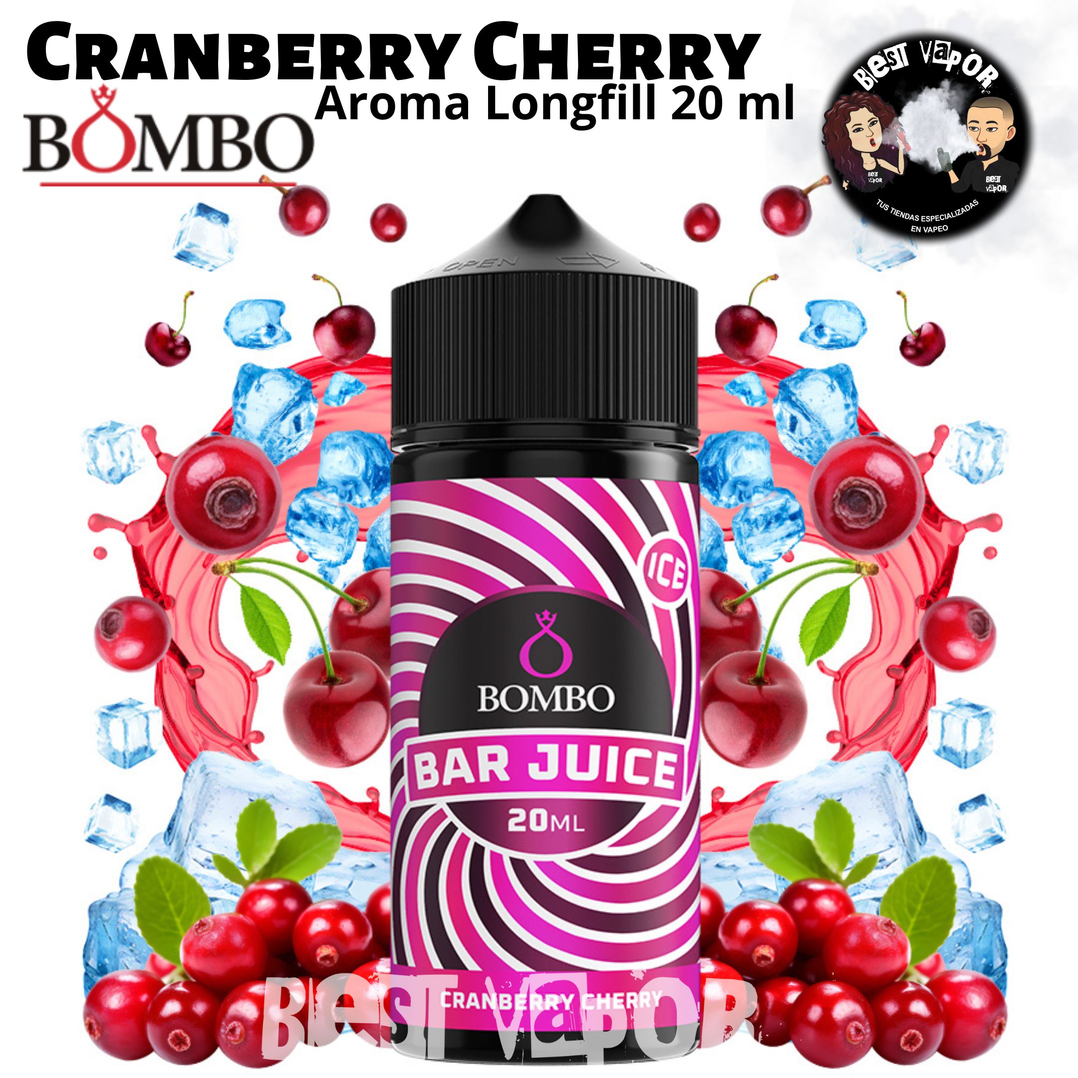 El aroma Cranberry Cherry Ice de Bar Juice by Bombo en formato Longfill es el equilibrio vibrante entre el punto ácido del arándano rojo y la dulzura profunda de la cereza, creando una mezcla frutal única.