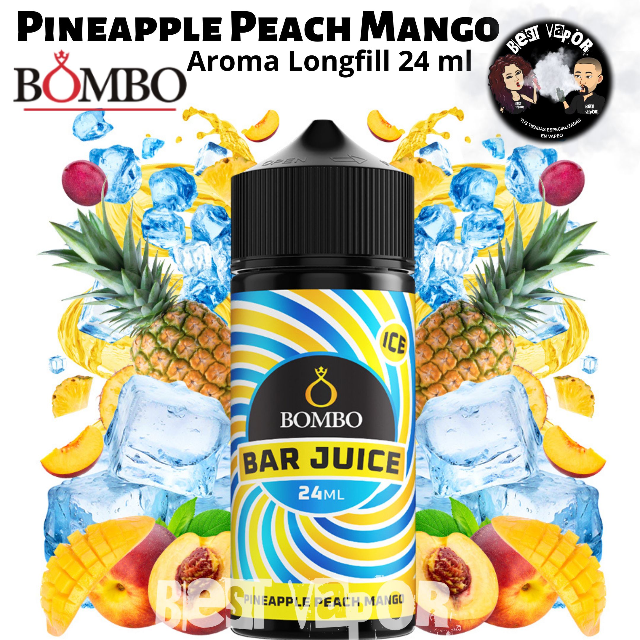 El aroma  Pineapple Peach Mango Ice de Bar Juice by Bombo en formato Longfill tiene un sabor tropical delicioso y fresquito:  la dulzura de la piña, la jugosidad del melocotón y la intensidad del mango, que combinan a la perfección para crear un sabor intenso y refrescante.