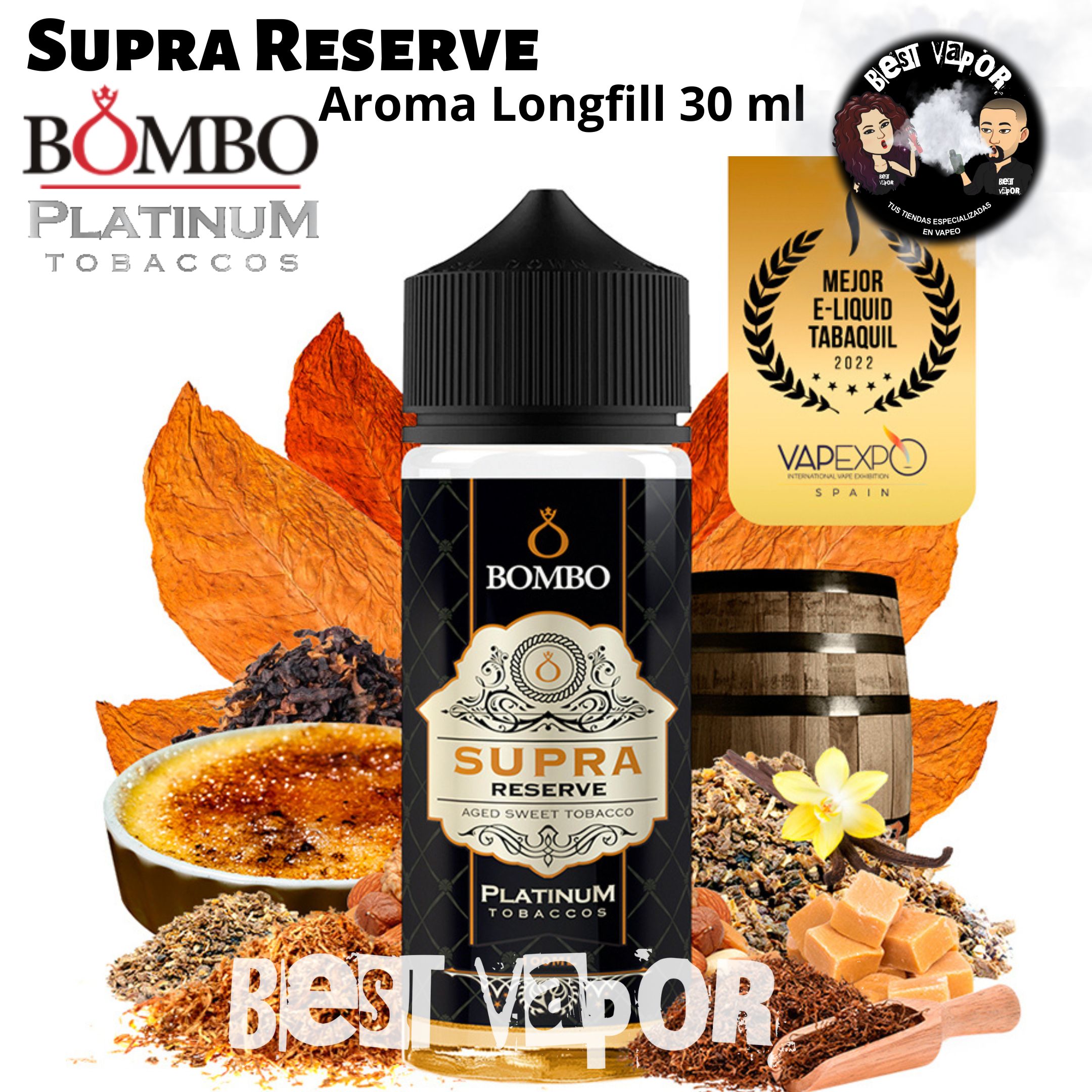 El aroma Supra Reserve de Platinum Tobaccos by Bombo en formato Longfill une tabaco dulce con matices acaramelados y tostados que, junto a una innovadora técnica de doble maceración, lo sitúa en el siguiente nivel dentro de los RY4. Premio al mejor tabaquil en Vapexpo Spain 2022.